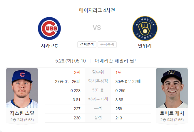 시카고 컵스는 최근 어려움을 겪고 있지만, 저스틴 스틸이 밀워키 브루어스를 상대로 좋은 성적을 기록한 적이 있어 이번 경기에서 반등할 가능성이 있습니다. 반면, 밀워키 브루어스는 홈 경기에서 강한 모습을 보이며, 로버트 개서의 안정적인 투구로 인해 유리한 경기를 펼칠 것으로 예상됩니다. 따라서 밀워키 브루어스의 승리를 예상합니다.