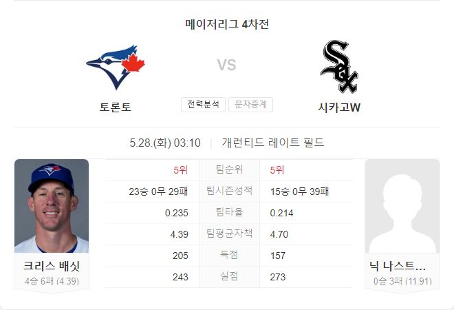 | 5월 28일 MLB 보스턴 레드삭스 VS 볼티모어 오리올스 타카짱의 경기 예측 분석 (0) | 2024.05.27 |