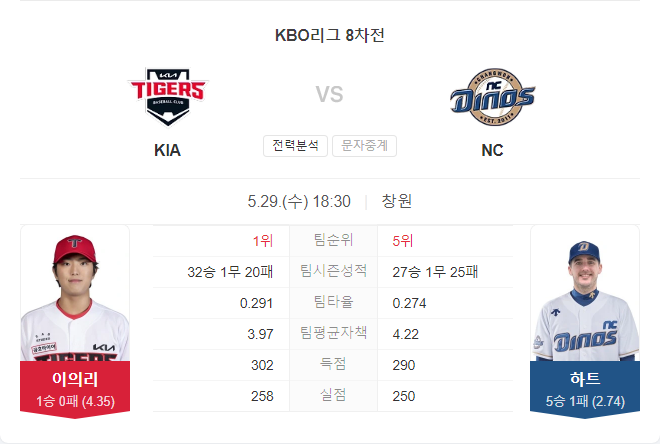 NC 다이노스의 카일 하트는 홈 경기에서 강력한 모습을 보이며 KIA 타이거즈를 상대할 예정입니다. 이의리는 재활 후 복귀한 상황에서 제구에 문제가 있을 수 있어 긴 이닝을 소화하기 어려울 것으로 보입니다.