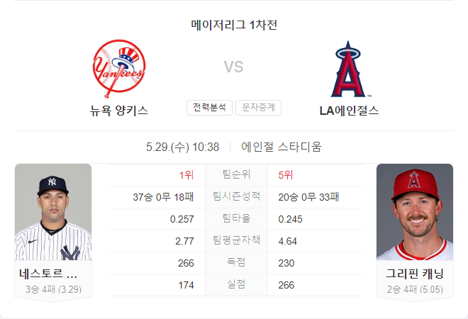 5월 29일 MLB 뉴욕 양키스 VS LA 에인절스 타카짱의 경기 예측 분석