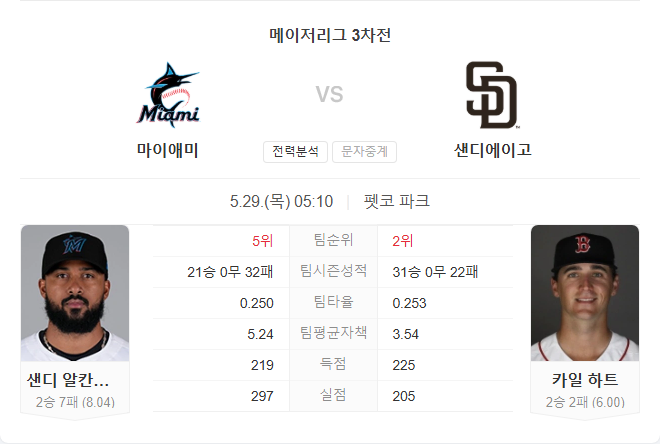 말린스는 최근 경기력 상승세에도 불구하고 샌디 알칸타라의 극심한 부진이 발목을 잡고 있습니다. 샌디에이고를 상대로 강한 전력을 보여온 이력이 있으나, 올 시즌 피칭 내용만 보면 신뢰도는 낮은 상황입니다. 타선 역시 찬스를 살리지 못하고 있는 점이 아쉽습니다.