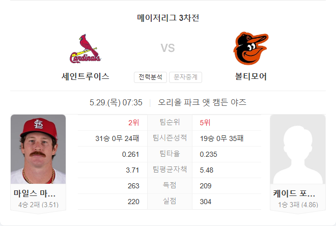 카디널스는 최근 상승세에 있으며 마이콜라스가 안정적인 피칭을 이어가고 있어 선발 싸움에서 우위를 점할 수 있습니다. 반면 오리올스는 일시적인 타선 폭발이 있었지만, 시즌 전반적인 성적이나 마운드 안정감 모두 부족한 상황입니다.