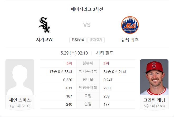 5월 29일 MLB 메이저리그 시카고 화이트삭스 VS 뉴욕 메츠 타카짱의 경기 예측 분석