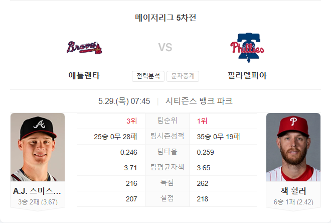 브레이브스는 원정에서 뚜렷한 마운드 약세를 보이며 경기 흐름을 유지하기 어렵습니다. A.J. 스미스-쇼버가 투구 내용은 준수하지만, 불안정한 제구와 필리스의 홈 타선에 고전할 가능성이 높습니다. 반면 필리스는 잭 휠러의 압도적인 투구력과 함께 홈 타선이 폭발적인 득점력을 유지하고 있어 경기 주도권을 가져갈 수 있습니다.