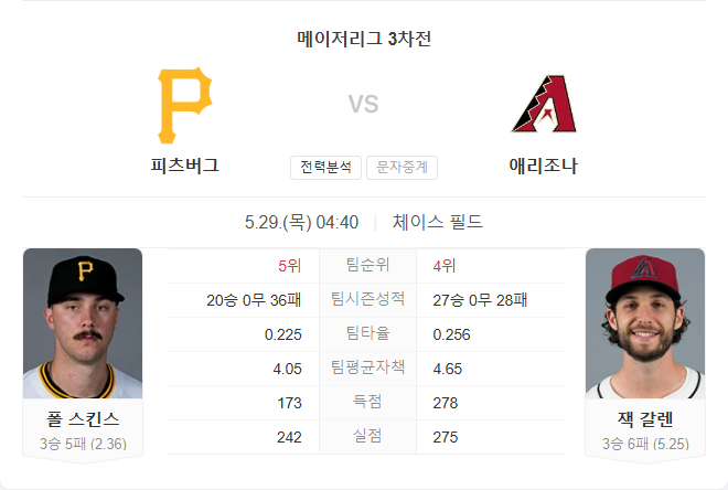 5월 29일 MLB 메이저리그 피츠버그 파이어리츠 VS 애리조나 다이아몬드백스 타카짱의 경기 예측 분석