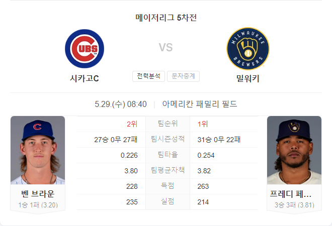 컵스는 최근 부진하지만 브라운의 안정적인 투구가 기대됩니다. 반면, 브루어스는 홈에서 강한 모습을 보이고 있습니다. 밀워키는 타선에서의 일관된 활약과 페랄타의 안정적인 투구로 경기를 유리하게 이끌 것으로 보입니다.