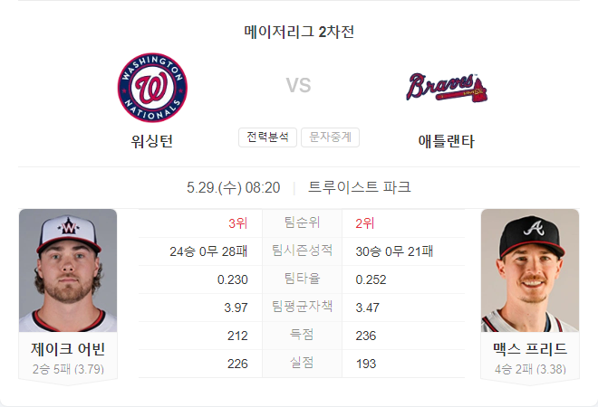 맥스 프리드의 최근 폼을 고려했을 때, 애틀랜타 브레이브스가 유리한 위치에 있습니다. 프리드는 워싱턴 타선을 상대로 안정적인 투구를 이어갈 가능성이 높으며, 워싱턴의 제이크 어빈은 최근 네 경기에서 팀이 패배한 기록을 가지고 있습니다. 따라서 애틀랜타 브레이브스가 이번 경기에서 승리할 가능성이 큽니다.