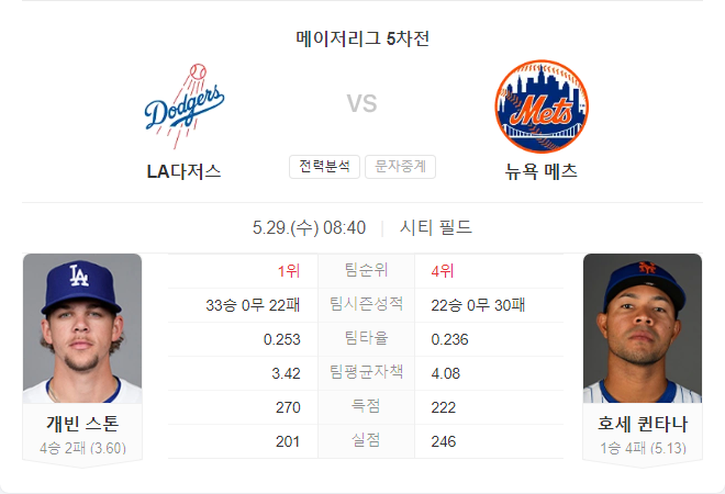 다저스가 이번 경기에서 유리한 위치에 있습니다. 다저스의 선발 투수 가빈 스톤은 최근 안정적인 투구를 보여주고 있으며, 메츠의 호세 킨타나는 시즌 내내 불안한 투구를 이어가고 있습니다. 또한, 다저스는 타선에서 강력한 모습을 보이고 있어 메츠를 상대로 우위를 점할 것으로 예상됩니다.