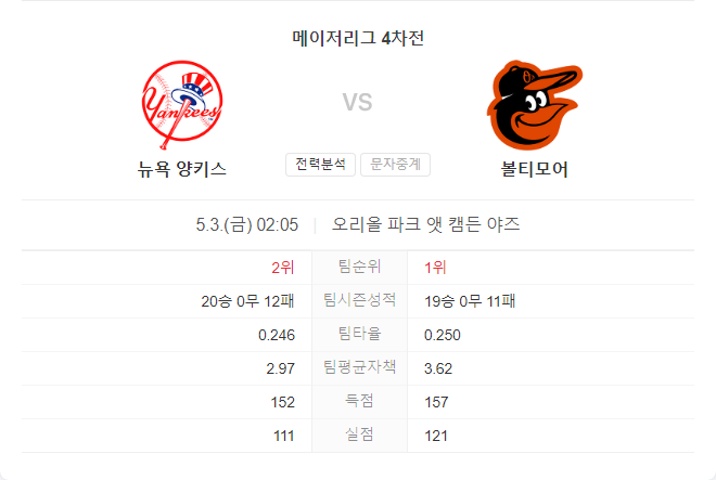 5월 3일 MLB 뉴욕 양키스 VS 볼티모어 오리올스 타카짱의 경기 예측 분석