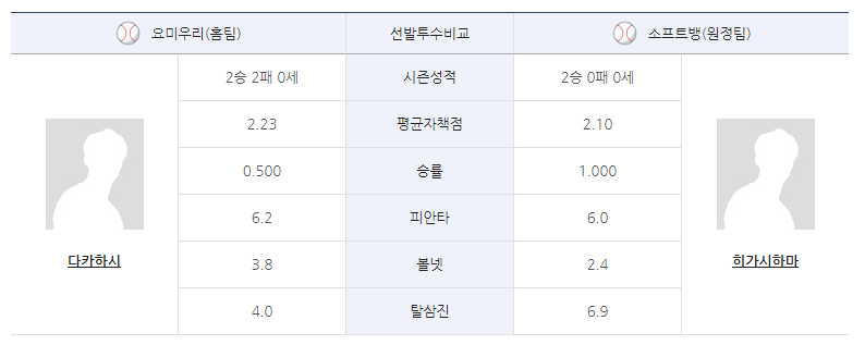 타카하시 레이는 좌타자 공략에 문제가 있으며, 돔구장의 히가시하마는 교류전에서도 강점을 보일 수 있는 투수입니다. 따라서 선발 투수의 우위를 고려할 때, 소프트뱅크 호크스가 승리에 더 가까울 것으로 보입니다.