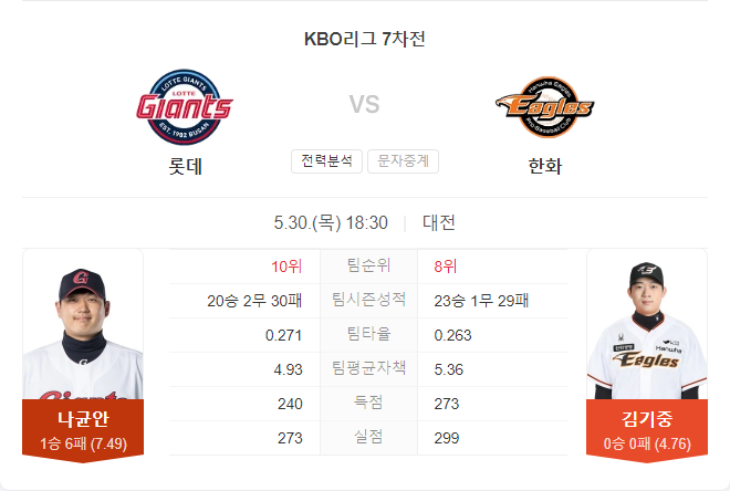 김기중을 상대하는 것이 나균안보다는 나을 수 있으나, 롯데의 타격이 큰 반등을 보이기 어려울 것으로 예상됩니다. 전력에서 앞선 한화 이글스가 승리에 가까워 보입니다.