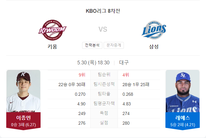 5월 30일 KBO 프로야구 키움 히어로즈 VS 삼성 라이온즈 타카짱의 경기 예측 분석