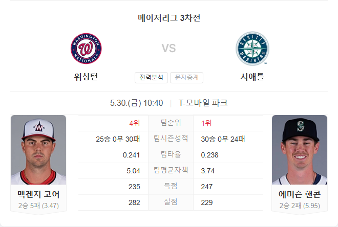 5월 30일 MLB 메이저리그 워싱턴 내셔널스 VS 시애틀 매리너스 타카짱의 경기 예측 분석