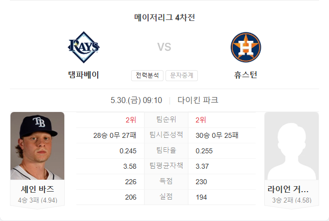 탬파베이는 바즈가 최근 다소 흔들리긴 했지만 토론토전에서 반등하며 자신감을 회복한 모습이며, 팀 마운드 전체가 비교적 안정적인 수치를 보이고 있습니다. 휴스턴은 최근 타선이 뜨겁지만, 선발 구스토가 매우 불안정한 성적을 기록 중이라는 점이 변수입니다.