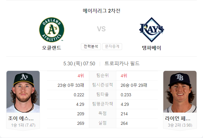 페피엇은 여러 이닝을 무실점으로 막아낼 수 있을 것이며, 탬파베이 타선은 오클랜드의 조이 에스테스를 상대로 득점을 올릴 수 있을 것입니다. 따라서, 레이스가 홈에서 승리할 가능성이 높습니다.