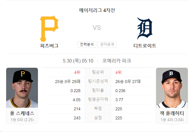 피츠버그 파이어리츠(25승 29패)는 디트로이트 타이거즈(26승 27패)와 시즌 마지막 경기를 치릅니다. 팀은 타격 부진으로 고전 중이며, 리그 하위권에 머물러 있습니다. 선발 투수 폴 스킨스는 시즌 초반 인상적인 활약을 펼치며 최근 두 경기에서 12이닝 동안 단 1점만 허용했습니다. 하지만 불펜이 불안정해 경기 마무리가 쉽지 않습니다.