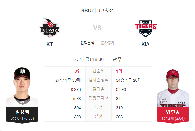기아 타이거즈의 최근 기세가 매우 무섭습니다. 엄상백은 KIA전 원정에서 5이닝 3실점을 기록했지만, 이번 경기에선 그 정도의 성적도 쉽지 않을 것으로 보입니다. 양현종은 홈 경기에서 여전히 안정적인 투구를 보여주고 있으며, KT의 불펜은 패배하는 경기에서 버티지 못하는 모습을 보이고 있습니다. 전력에서 앞선 기아 타이거즈가 승리에 가까이 있습니다.