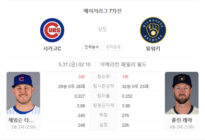 이번 경기는 밀워키 브루어스가 유리할 것으로 보입니다. 브루어스는 홈에서 강한 모습을 보이고 있으며, 타선도 컵스보다 안정적입니다. 특히 타이욘이 최근 부진한 반면, 레아는 홈에서 안정적인 투구를 이어가고 있어 브루어스의 승리가 예상됩니다. 따라서 밀워키 브루어스가 이길 가능성이 높습니다.