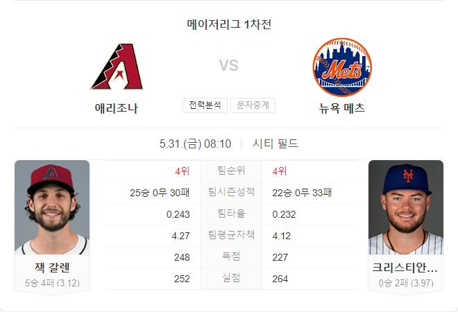뉴욕 메츠(22-33)는 목요일 저녁 애리조나 다이아몬드백스를 상대로 시리즈를 시작합니다. 메츠는 크리스찬 스콧을 선발로 내세웁니다. 스콧은 최근 경기에서 자이언츠를 상대로 6이닝 2실점을 기록하며, 시즌 3.97 ERA와 1.10 WHIP를 유지하고 있습니다.