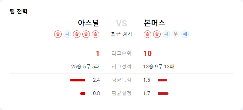 아스날과 본머스의 경기에서는 아스날이 명확한 우위를 점할 것으로 예상됩니다. 아스날의 강력한 측면 공세와 중앙 패스 게임은 본머스의 압박을 효과적으로 무너뜨릴 수 있으며, 본머스의 수비 취약점을 공략할 충분한 능력을 갖추고 있습니다.