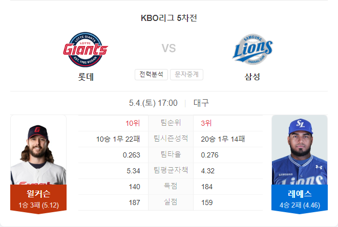5월 4일 KBO 프로야구 롯데 자이언츠 VS 삼성 라이온즈 타카짱의 경기 예측 분석