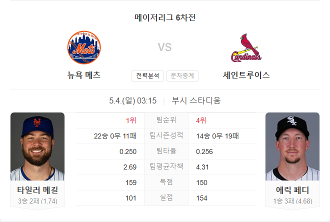 이번 경기는 메츠의 선발 투수 타일러 메길과 카디널스의 에릭 페디의 맞대결로 펼쳐집니다. 메길은 시즌 평균자책점 1.74로 안정적인 피칭을 이어가고 있으며, 최근 5경기에서도 뛰어난 성적을 기록하고 있습니다. 반면, 페디는 최근 등판에서 불안한 모습을 보이며 팀의 마운드에 부담을 주고 있습니다.