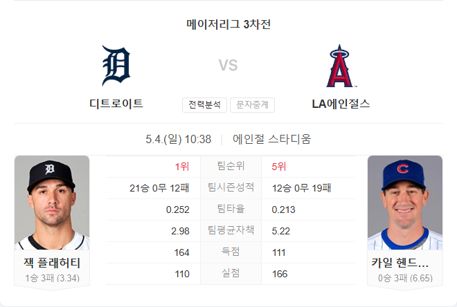특히 에인절스는 불펜의 불안정성과 주축 선수들의 부상으로 인해 전력에 큰 타격을 입고 있습니다. 전체적인 전력과 최근 흐름을 고려할 때 타이거스의 승리가 유력해 보입니다.