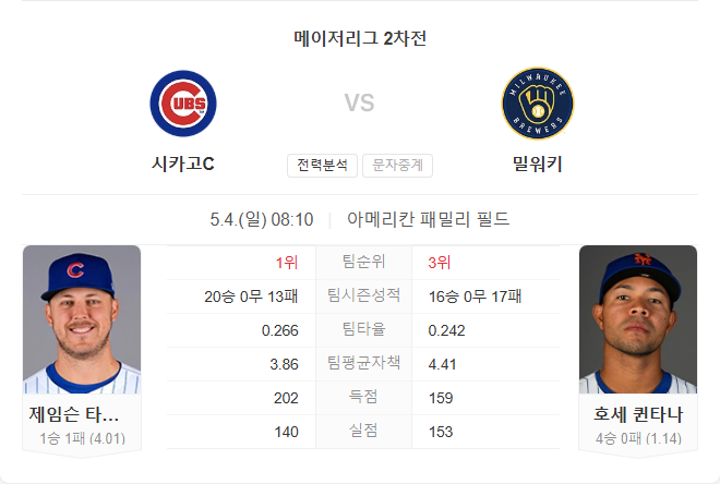 5월 4일 MLB 메이저리그 시카고 컵스 VS 밀워키 브루어스 타카짱의 경기 예측 분석