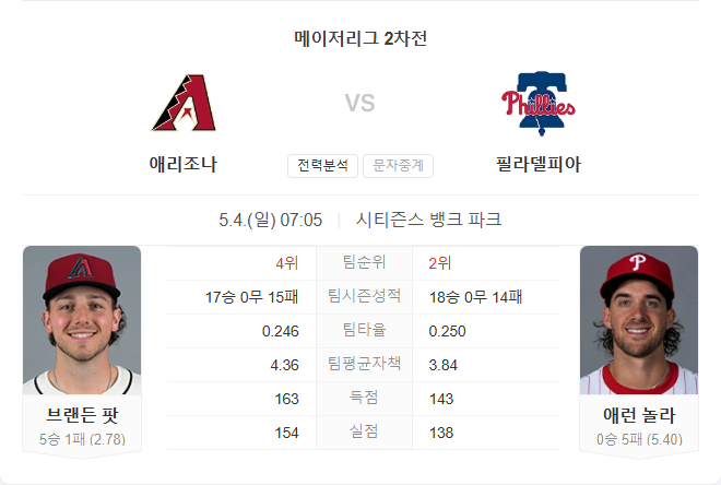 이번 경기는 양 팀의 선발 투수들이 안정적인 피칭을 펼칠 것으로 예상되며, 타선에서는 필리스가 우위를 점할 것으로 보입니다.