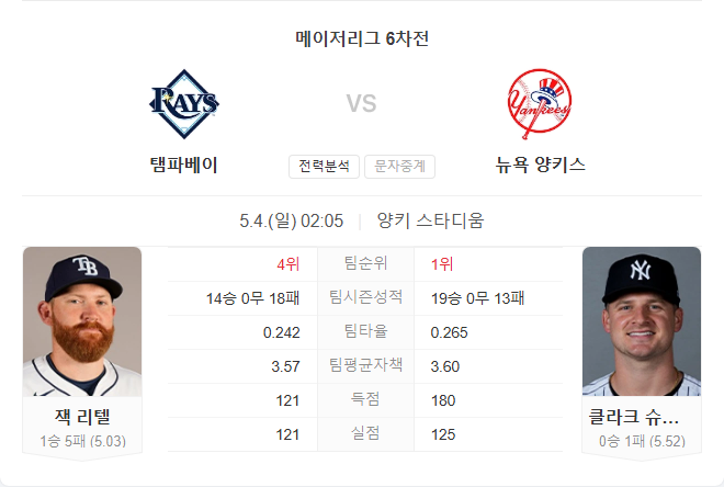 이번 경기는 양 팀 선발 투수 모두 불안한 기록을 보이고 있어 타격전 양상이 예상됩니다. 그러나 최근 상승세인 양키스 타선이 리텔을 상대로 빠르게 경기를 주도할 가능성이 높습니다.