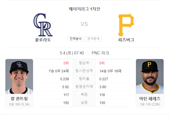 콜로라도는 계속된 패배로 인해 팀 분위기가 매우 좋지 않고, 특히 타선의 부진이 심각한 상태입니다. 반면, 피츠버그도 타선은 좋지 않지만, 페레즈 같은 안정된 선발 투수가 있어 홈에서 반등할 가능성이 높습니다.