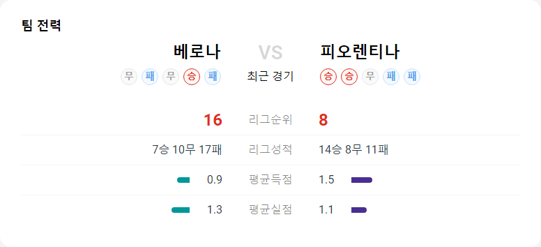 베로나는 현재 이탈리아 1부 리그에서 15위를 차지하고 있습니다. 최근 피오렌티나와 같은 중원 전력이 강한 팀을 상대할 때는 약한 모습을 보였으며, 세르다르 등 미드필더들이 전진하는 주요 패턴이 단단한 중원 팀들에게 효과적이지 못했습니다.