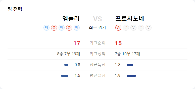 엠폴리와 프로시노네의 경기는 양 팀 모두 수비적인 문제와 득점력의 한계를 극복해야 하는 상황입니다. 엠폴리는 득점력이 부족하지만 수비적으로 안정된 경기를 펼치며, 프로시노네는 원정 경기에서의 부진을 극복해야 합니다.