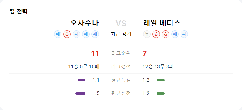 오사수나와 레알 베티스의 경기는 양 팀 모두 결장자가 많고 공격에서 어려움을 겪을 가능성이 있습니다. 오사수나는 수비적으로 안정된 모습을 보여야 하며, 베티스는 압박에 취약한 부분을 보완해야 합니다.