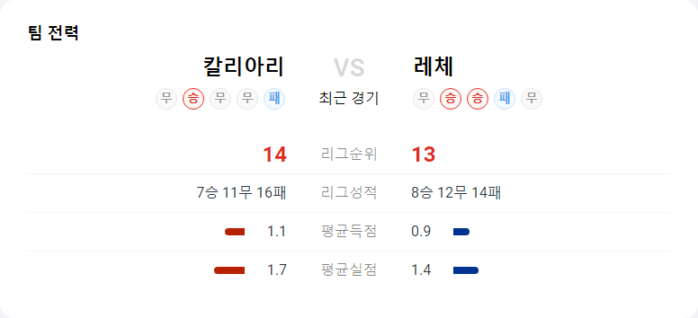 칼리아리는 현재 이탈리아 1부 리그에서 14위에 위치하고 있으며, 홈 경기에서 강한 모습을 보여줍니다. 아탈란타와 유벤투스를 상대로 승점 4점을 얻는 등 홈에서의 공격력이 돋보이지만, 레체가 최근 수비적으로 안정적인 모습을 보여주고 있다는 점을 염두에 두어야 합니다.