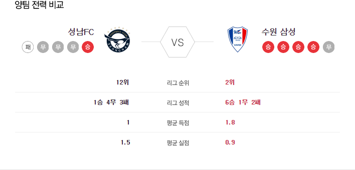 실제로 성남은 공수 전환을 빠르게 하고 공격적으로 나설 때 무패 행진을 기록했지만, 수원삼성을 상대로 맞불을 놓는 것은 결과를 장담하기 어렵습니다. 수원삼성이 역습에 강하기 때문입니다. 주요 결장자는 가브리엘(FW)로, 전력의 약 8%가 결장합니다.