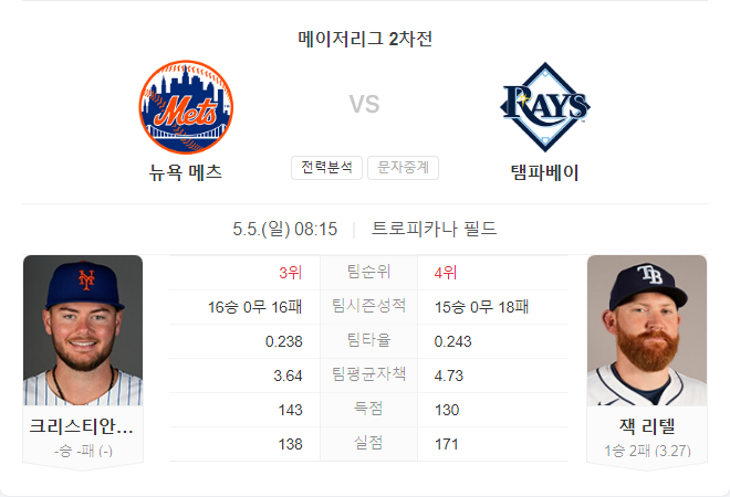 5월 5일 MLB 뉴욕 메츠 VS 탬파베이 레이스 타카짱의 경기 예측 분석