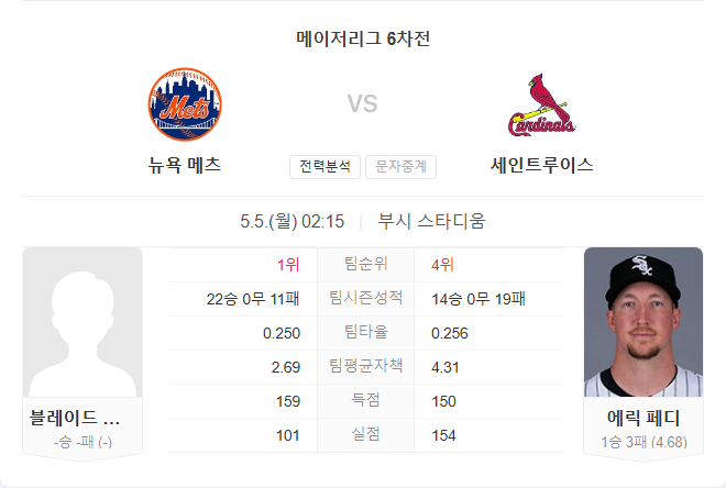 5월 5일 MLB 메이저리그 뉴욕 메츠 VS 세인트루이스 카디널스 타카짱의 경기 예측 분석