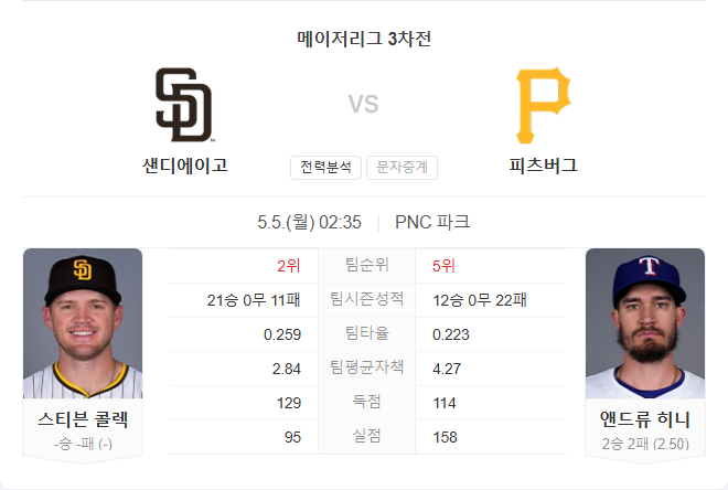 전날 경기에서는 9회 초 페르난도 타티스 주니어의 득점으로 2-1 승리를 거두며, 피츠버그와의 시리즈에서 2연승을 기록했습니다. 시즌 성적은 21승 11패로 내셔널리그 서부지구 2위를 유지하고 있으며, 원정에서는 7승 7패를 기록 중입니다. 선발 투수 스티븐 콜렉은 이번 경기를 통해 시즌 첫 선발 등판에 나서며, 지난 시즌에는 불펜으로 42경기에 출전하여 3승 무패, 평균자책점 5.21을 기록했습니다.