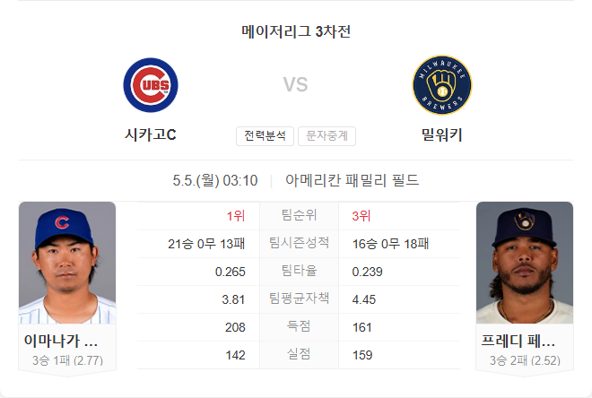 브루어스는 전날 경기에서 컵스에게 0-10으로 패하며 최근 5경기 성적은 2승 3패를 기록 중입니다.