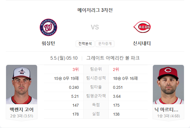내셔널스는 고어가 꾸준한 피칭을 이어가고 있는 가운데, 전날 타선이 폭발하며 좋은 흐름을 만들었습니다. 반면 레즈는 몬타스가 경기 초반을 무난히 막아내는 경우 후반 뒷심이 강한 팀이지만, 최근 불펜의 기복이 변수입니다.