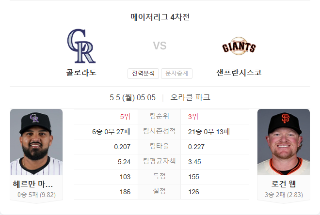자이언츠는 전날 경기에서 맷 채프먼의 만루홈런에 힘입어 6-3 승리를 거두며 시즌 성적 21승 13패, 최근 5경기 3승 2패를 기록 중입니다.