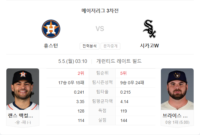 5월 5일 MLB 메이저리그 휴스턴 애스트로스 VS 시카고 화이트삭스 타카짱의 경기 예측 분석