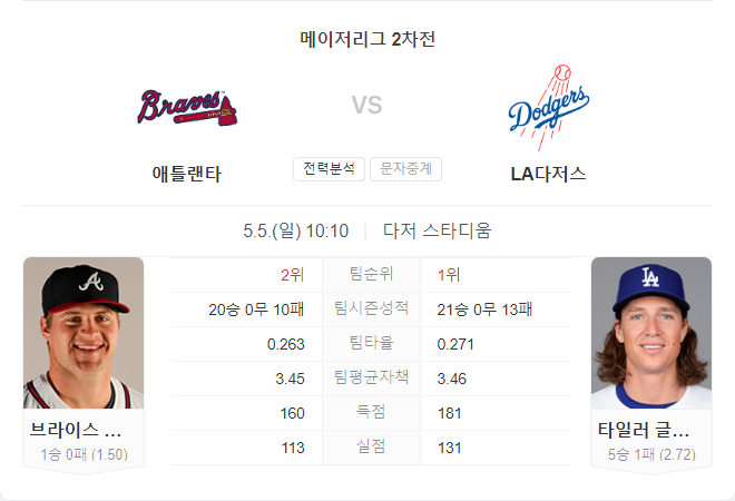 5월 5일 MLB 애틀랜타 브레이브스 VS LA 다저스 타카짱의 경기 예측 분석