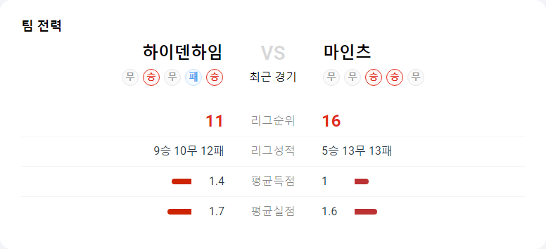 하이덴하임은 현재 독일 1부 리그 10위를 기록하고 있습니다. 직전 마인츠와의 대결에서 1-0으로 승리했지만, 당시 경기 내용은 마인츠가 더 우세했습니다.