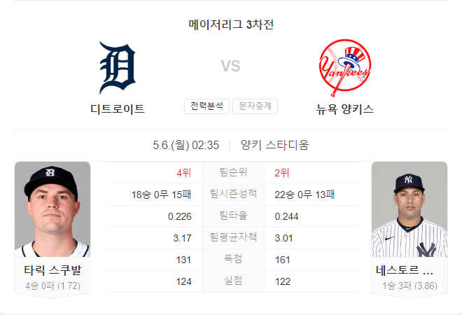 애런 저지는 센터 필더이자 팀을 대표하는 선수로, 6개의 홈런과 19개의 타점을 기록하며 중심 타선의 역할을 해내고 있습니다. 이번 경기에 선발로 나서는 네스터 코르테스는 올 시즌 3.86의 ERA로 조금 흔들리는 모습을 보였으나, 꾸준한 성적을 기대할 수 있습니다.