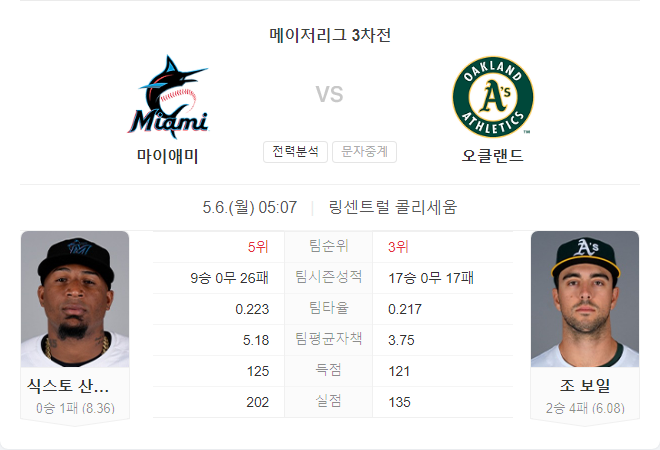 5월 6일 MLB 마이애미 말린스 VS 오클랜드 어슬레틱스 타카짱의 경기 예측 분석
