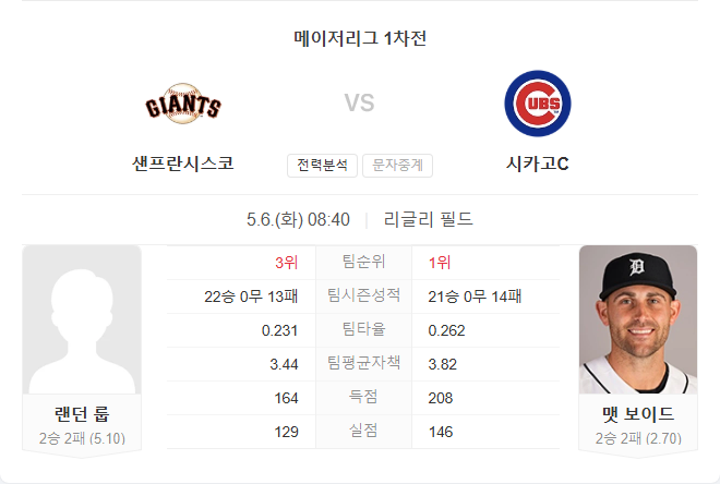 보이드의 안정적인 홈 피칭과 강력한 타선을 고려할 때, 자이언츠의 루프가 컵스 타선을 막아내기 어려울 것으로 보입니다.
