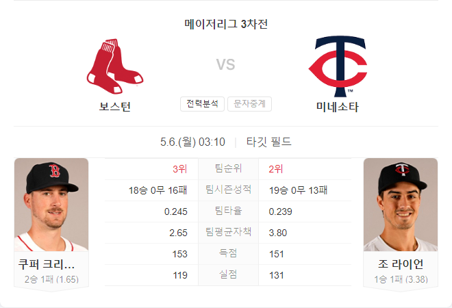 보스턴 레드삭스는 최근 공격력에 기복을 보이고 있어 조 라이언의 삼진 능력을 상대로 힘든 경기가 예상됩니다. 반면 미네소타 트윈스는 쿠퍼 크리스웰의 제구력에도 불구하고 타선의 화력이 살아있어 홈구장에서 승리를 이어갈 것으로 보입니다.
