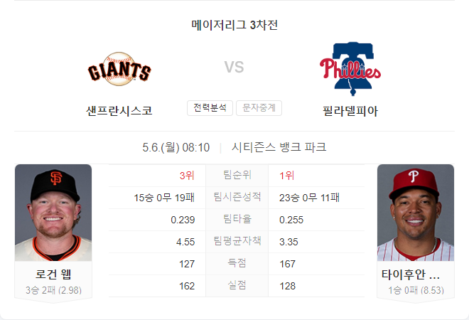 | 5월 7일 MLB 샌프란시스코 자이언츠 VS 필라델피아 필리스 타카짱의 경기 예측 분석 (0) | 2024.05.06 |
